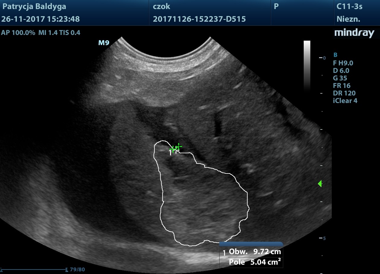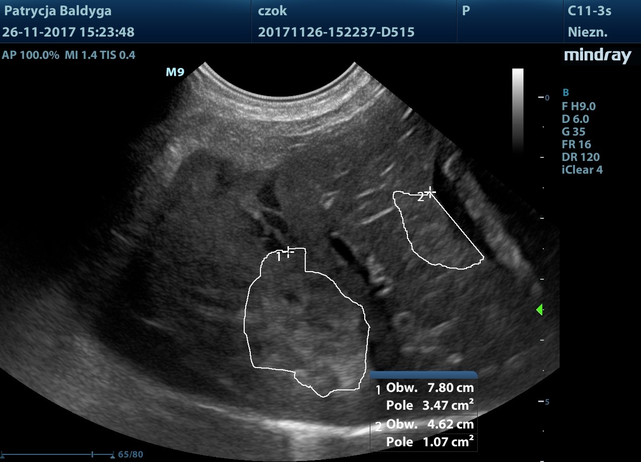 Miąższ szczególnie płatów lewych o miejscowo wzmożonej echogeniczności, nieco nieregularnej torebce, z obecnością zmiany ogniskowej najpewniej krwiaka pourazowego ok. 3,2 x 1,6 cm w płacie lewym bocznym modulującego znacznie torebkę powierzchni trzewnej.