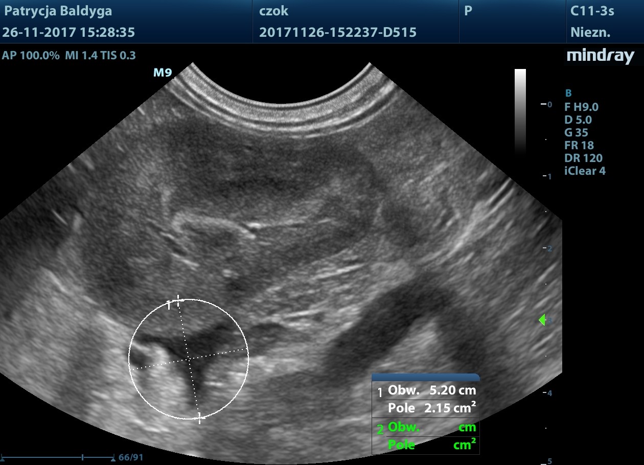 Miąższ szczególnie płatów lewych o miejscowo wzmożonej echogeniczności, nieco nieregularnej torebce, z obecnością zmiany ogniskowej najpewniej krwiaka pourazowego ok. 3,2 x 1,6 cm w płacie lewym bocznym modulującego znacznie torebkę powierzchni trzewnej.